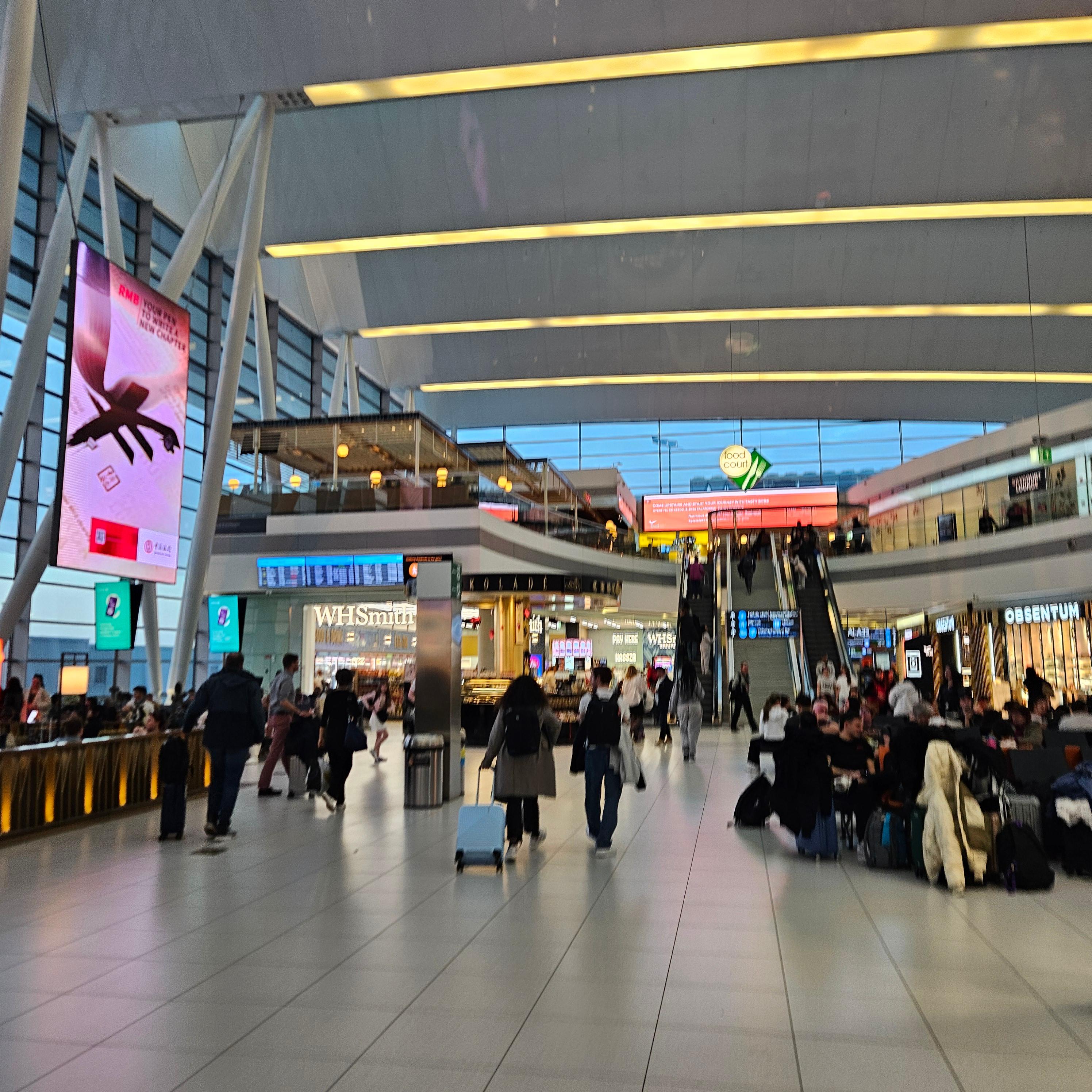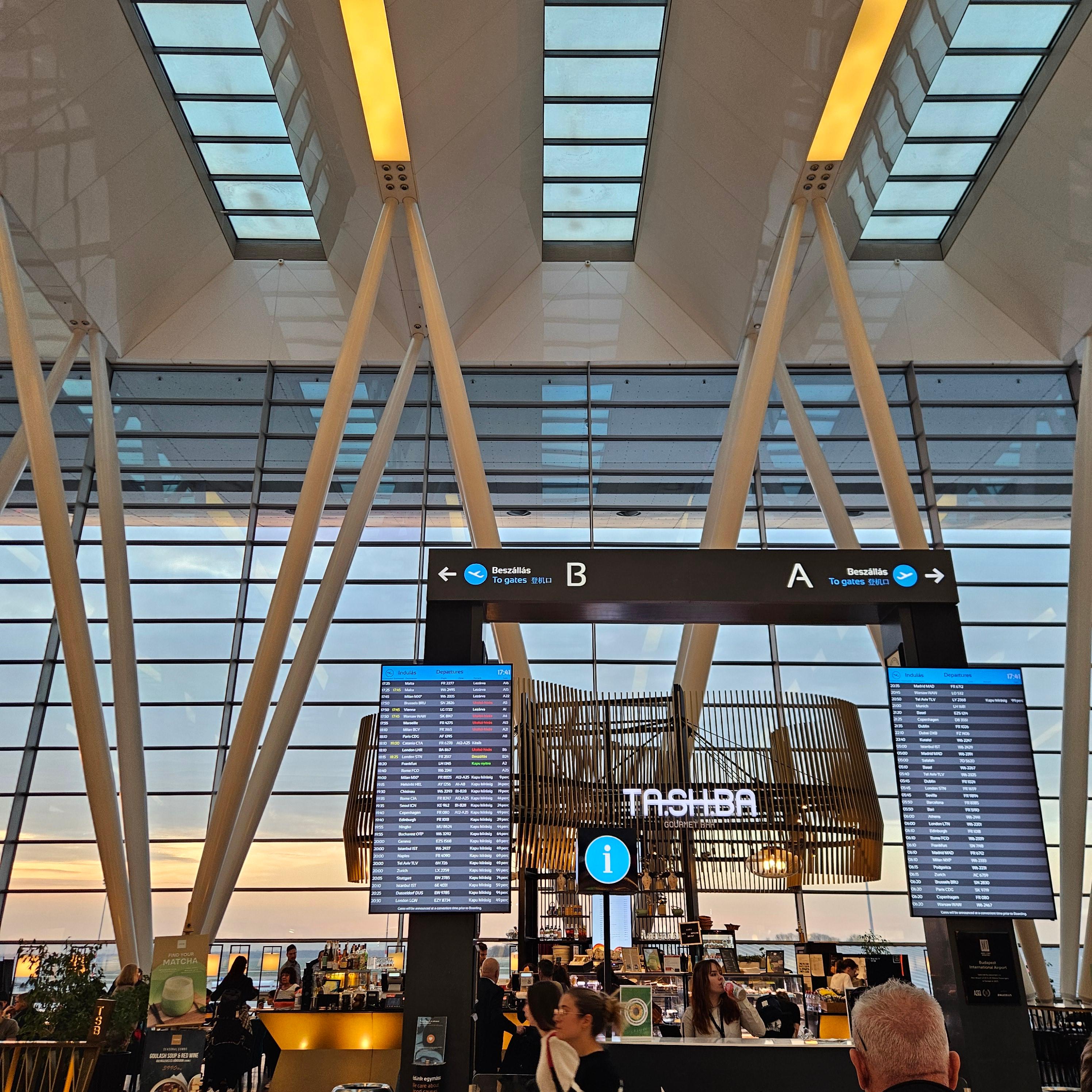 부다페스트 공항은 그리 크지 않은 공항으로, 전체적으로 깔끔하고 효율적인 공간을 제공합니다. 공항은 2층으로 구성되어 있으며, 2층에서는 출발과 관련된 대부분의 시설들이 위치해 있습니다. 공항 내에서는 체크인 카운터와 여러 면세점, 그리고 간단한 음료와 간식을 파는 부스들이 마련되어 있어 여유를 가지며 기다리기에 좋습니다.